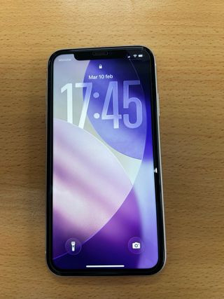 Teléfono móvil iPhone 11 en color blanco y con capacidad de almacenamiento de 64 GB. Unico detalle en la pantalla tiene una pequeña marca Batería al 72 % Funciona perfectamente