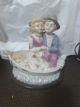 Precioso adorno de mesa o mueble con una pareja sentada en una barca. - Figura de cerámica detallada. - Base decorativa. - Diseño romántico,dedicado a la historia del Titanic eso me an dicho por si antigüedad.