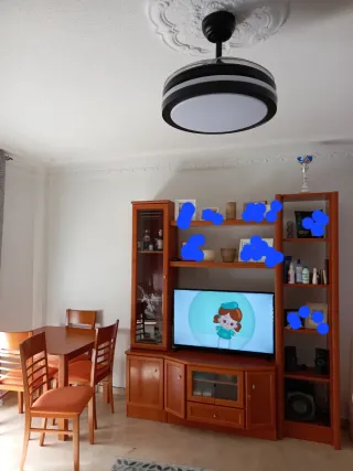 Conjunto de mueble, mesa y cuatro sillas de madera maciza. - Mueble de salón modular. - Mesa de comedor. - Cuatro sillas. Pedir medidas de lo que necesites. Esta todo en buen estado. El mueble tiene un desperfecto, pongo foto.
