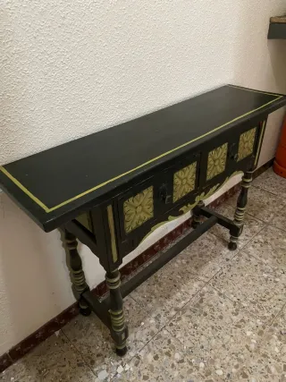 Elegante mesa de entrada con un diseño tallado y detalles en dorado. - Acabado principal en negro. - Detalles decorativos en dorado. - Fabricada en madera.