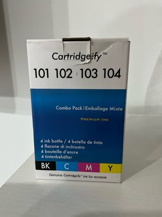 Pack combinado de tinta para impresora Cartridgeify. - Incluye 4 botellas de tinta. - Modelos: 101, 102, 103, 104. - Colores: BK, C, M, Y. - Tinta premium para ecotank.