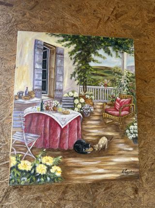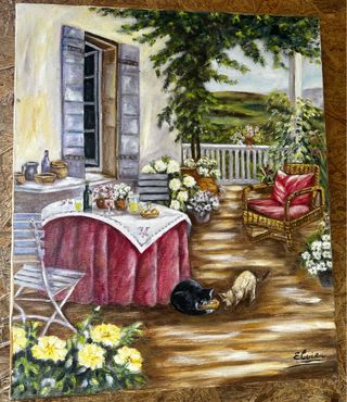 Preciosa pintura al óleo de una escena de terraza. - Representa una terraza con una mesa puesta y dos gatos. - Paisaje de fondo con colinas verdes. - Tonos verdes y rojos predominantes.