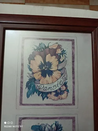 Precioso cuadro decorativo con motivos florales, ideal para dar un toque de color a tus paredes. Presenta tres láminas con diferentes flores. - Marco de madera. - Ilustraciones de Pansies, Hollyhocks y Geranium. - Las medidas se pueden observar en las fotografías - El envío sería solo por la misma aplicación de wallapop para mayor rapidez y seguridad del comprador y del vendedor ó entrega en mano