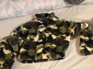 Chaqueta corta con estampado militar de camuflaje. Es una prenda de tacto suave y cálido. - Diseño de camuflaje. - Cuello alto. - Cierre de cremallera.
