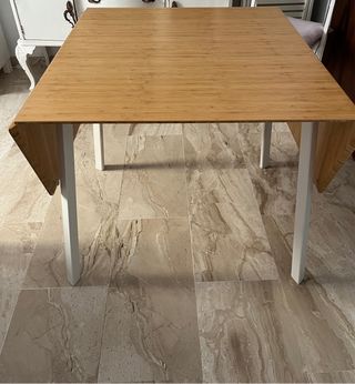 Mesa con diseño moderno y funcional, ideal para espacios reducidos. Sus laterales abatibles permiten adaptar su tamaño según la necesidad. Alguna señal de uso en el tablero pero totalmente funcional. Cada ala aporta 32 cm, en total se ganan 64 cm. - Tablero de madera con acabado natural. - Patas de metal blanco.