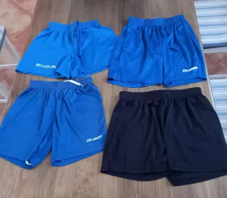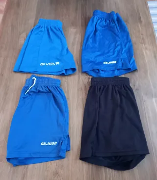 Varios pantalones cortos deportivos para niños y niñas, a 2 € la unidad, o a 6 € el lote de los 4. Varias tallas y marcas: - 1. Color azulón, marca GIVOVA, talla 2XS. - 2. Color azulón, marca CEJUDO, talla 10 (128-140 cm). - 3. Color azulón, marca CEJUDO, talla 14 (156-162 cm) - 4. Color negro, marca Roly, talla 12. Este presenta un pequeño enganche en la parte delantera.