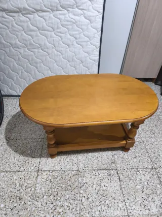 Elegante mesa baja de madera con un diseño clásico y funcional. Perfecta para complementar tu sala de estar. - Acabado en tono madera natural. - Diseño ovalado con balda inferior. - Patas torneadas con detalle.