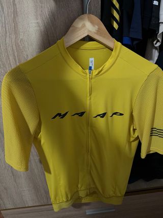 Maillot de ciclismo MAAP, sin usar. Talla XL - Color amarillo vibrante. - Mangas cortas con tejido de malla. - Cremallera frontal completa. - Logo MAAP en contraste en el pecho. - Detalles de rayas en las mangas.