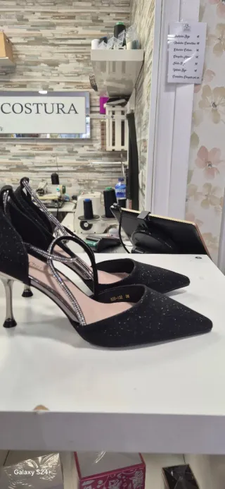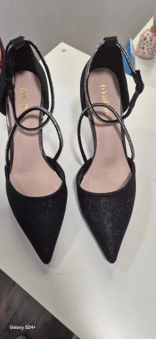 Elegantes zapatos de tacón con un diseño brillante y detalles de pedrería. - Acabado con purpurina. - Tira al tobillo con cierre de hebilla. - Tira delantera adornada con pedrería. - Punta fina. Numeros disponibles 37,38,39 y 41