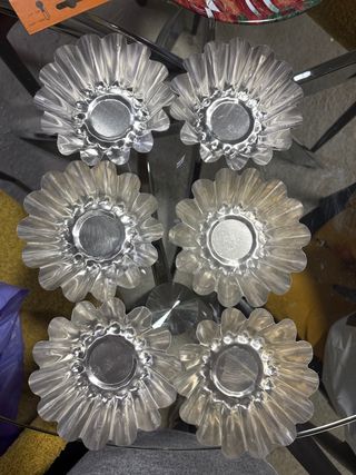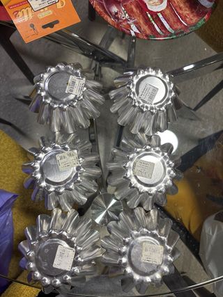 Conjunto de seis moldes para flan con un diseño floral. - Fabricados en metal. - Color plateado.