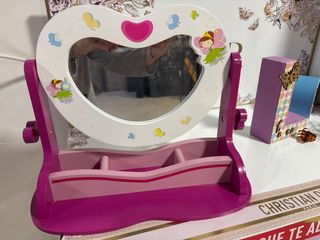 Precioso espejo de sobremesa con forma de corazón, ideal para habitaciones infantiles. Cuenta con un práctico cajón para guardar pequeños tesoros. - Diseño con mariposas y hada. - Base con compartimentos. - Estructura de madera. - Color rosa fucsia y blanco.