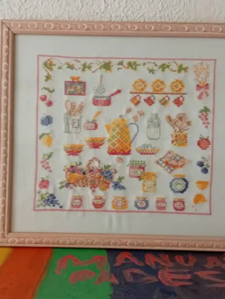 Bonito cuadro de punto de cruz con motivos de cocina y flores. - Diseño detallado con elementos de cocina. - Borde floral decorativo.