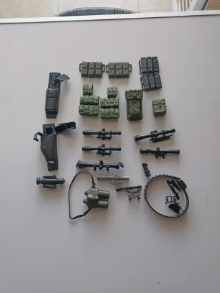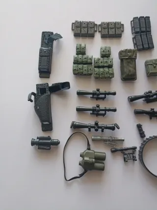 Conjunto de accesorios a escala 1/6, ideal para figuras. - Incluye varios visores y miras telescópicas. - Variedad de fundas y porta cargadores. - Elementos para cinturón táctico. - Prismáticos con correa.