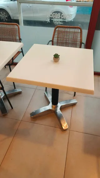Mesa de comedor o auxiliar con un diseño moderno y elegante. - Tablero cuadrado de color beige. - Base de metal con un acabado pulido. - Pie central con detalles en ratán. Medidas 70cm x 70cm Tengo 4 mesas, cada una 20€ Si se llevan las 4 juntas 70€ por las 4