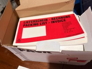 Pack de 500 sobres porta documentos Packing List o Lieferschein - Rechnung. Ideales para envíos. • Texto impreso: Multilingüe (Lieferschein - Rechnung / Packing List - Invoice). • Color: Rojo vibrante de alta visibilidad para que el transportista no lo pase por alto. • Características: • Autoadhesivos: Gran agarre sobre cajas de cartón, plástico o sobres. • Impermeables: Protegen la documentación de la lluvia y el polvo durante el transporte. • Material: Polietileno de alta calidad (PE-LD). • Estado: Completamente nuevos, sin estrenar.