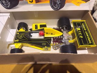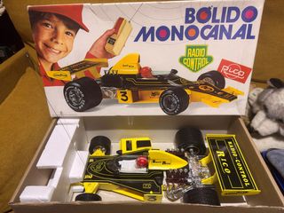 Coche de radiocontrol clásico Bolido Monocanal de Rico. Un modelo retro para coleccionistas. - Diseño de coche de carreras. - Decoración en amarillo y negro. - Incluye el coche y su mando. - Ruedas de goma. - Ala trasera con logo Rico Radio-Control. - Número 3 visible en el coche. Funcioba perfecto !