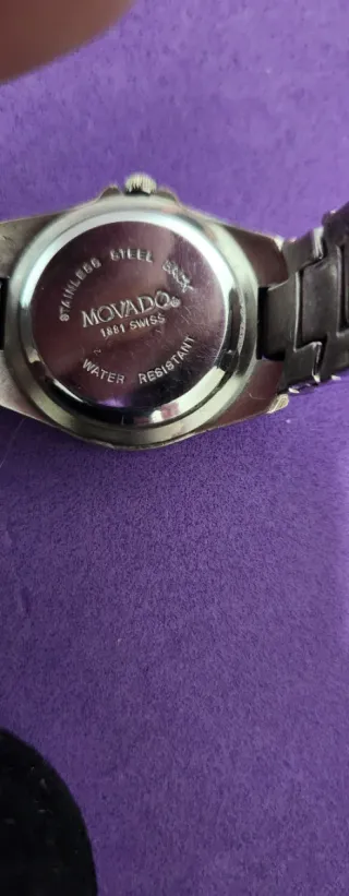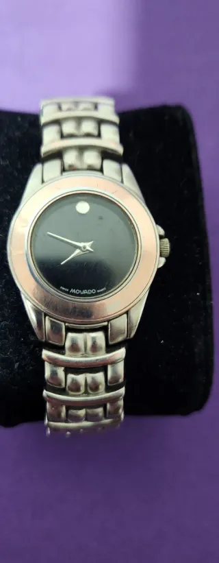 Elegante reloj Movado para mujer con una combinación de colores negro y plateado. - Diseño con esfera negra. - Pulsera de eslabones plateados. - Bisel con un toque de color rosado.