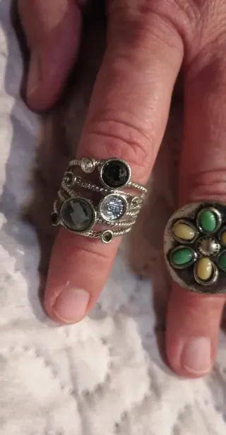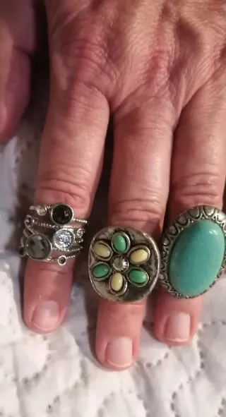 Conjunto de tres anillos con un diseño llamativo y detalles de piedras. - Anillo con varias piedras redondas y facetadas. - Anillo con diseño floral y piedras verdes y amarillas. - Anillo ovalado con una gran piedra turquesa.