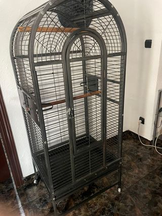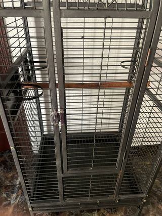 Jaula espaciosa y robusta, ideal para loros, cotorras o aves de tamaño similar. Se encuentra en excelente estado de conservación. - Estructura de metal resistente. - Puerta frontal con cierre de seguridad. - Bandeja extraíble para facilitar la limpieza. - Incluye perchas de madera. - Base con ruedas para un fácil desplazamiento.