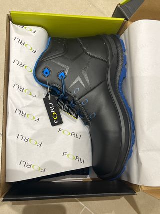 Calzado de seguridad de la marca FORLI. - Color negro con detalles en azul. - Diseño de bota alta.