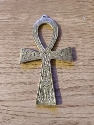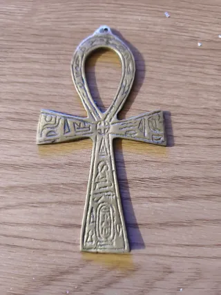 Este es un amuleto de cruz egipcia Ankh. - Diseño detallado con jeroglíficos. - Acabado metál dorado. - Medidas 11 Ctms por 6 Ctms.