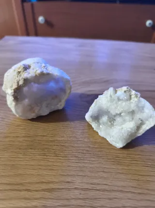 Dos geodas de cristal de roca con interior cristalino. - Una geoda abierta con cavidad interior. - Otra geoda con formación de cristales en la superficie.