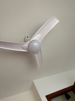 Ventilador de techo con un diseño moderno y elegante. - Acabado en color blanco. - Fabricado en plástico resistente.