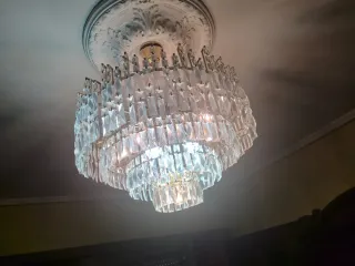 Elegante lámpara de techo con múltiples capas de cristales colgantes. - Estructura metálica con acabado dorado. - Cristales de vidrio transparente. - Diseño de cascada.