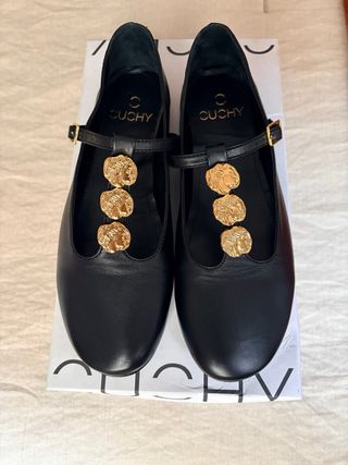 Elegantes bailarinas de la marca Cuchy, modelo Abril. - Diseño en color negro. - Detalle de adornos dorados: monedas bañadas en oro 24k. - Correa con hebilla. - Acabado en punta redonda.