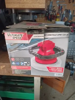 Pulidora orbital de la marca Ultimate Speed, modelo UPM 120 B. Ideal para trabajos de pulido y abrillantado. - Potente y con intensa oscilación orbital. - Incluye 4 paños lavables para pulir. - Incluye 2 esponjas de pelo sintético. - Mango ergonómico para dos manos. - Cable de 5 metros de longitud. No se ha usado nunca
