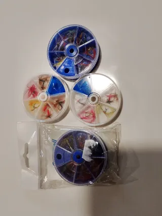 Conjunto de cajas circulares con moscas de pesca de fantasía. - Variedad de colores y diseños. - Cajas transparentes con divisiones. - Ideales para pesca deportiva.