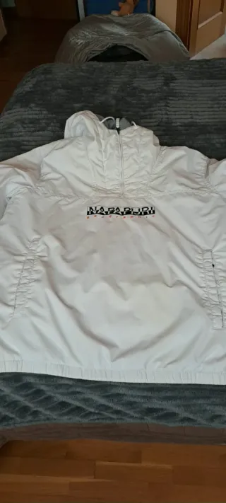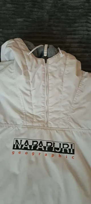Vendo a este precio porque como se puede apreciar, tiene unas sombras en la parte delantera por culpa de mal almacenamiento. Hay que fijarse para verlas pero quiero avisar y que a nadie le coja por sorpresa. La prenda se habrá usado 4 veces máximo, fue un regalo que no gustó al destinatario y se ha tirado 2 años en el armario, por eso lo vendo. A parte de esas sombras, está en perfecto estado como puede apreciarse. Abrigo estilo anorak de la marca Napapijri en color blanco. Es una prenda ligera y cómoda. Capucha, interior polar, cremallera lateral, dos bolsillos. Medidas 70 sisa, largo 75 y mangas 70 cm.