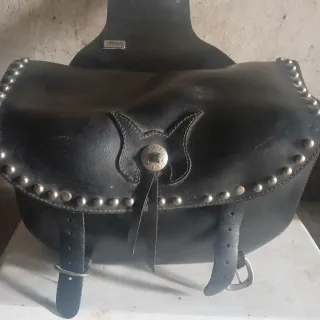 Alforjas de cuero negro para moto custom, con un diseño clásico y detalles de tachuelas plateadas. - Material: Cuero. - Color: Negro. - Adorno: Tachuelas plateadas. - Cierre: Hebillas y correas.