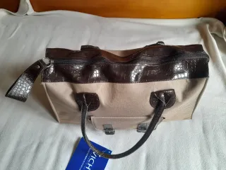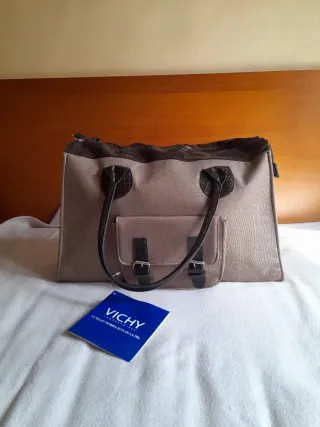 Marrón claro, con detalles oscuros, amplio. Medidas en fotografía 3: 48 cm de largo 48 cm de alto con asas, 33 cm de alto sin las asas 11 cm de ancho