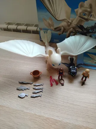 Set de Playmobil de la película de dragones Cómo entrenar a tu dragón 70038. Completo, y como nuevo. No se ha jugado con él, está impecable para un regalo. Incluye la caja y las instrucciones. El envío se hace protegido para que llegue bien a su nuevo destino. Incluye: Dragón blanco (Furia Diurna o luminosa). Impecable, conserva su color original blanco nácar. Tiene todas sus uñas intactas. Y las alas perfectas. Lanza flechas rosas. Los niños vikingos hijos de Astrid e Hipo. Completos, la niña con su bolso. El niño con su cinturón y se daga. Dragón bebe negro ojos azules. Hijo de Desdentao y Furia Diurna. Cesto con sus 7 peces.