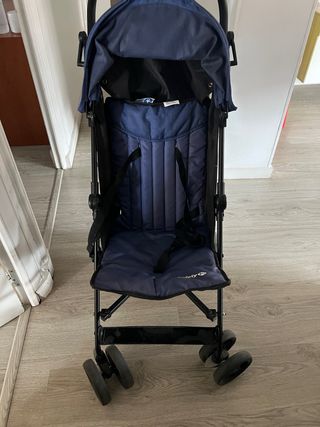 Cochecito de bebé ligero y compacto, ideal para viajes. - Color azul marino. - Diseño plegable para fácil transporte. - Arnés de seguridad de 5 puntos.