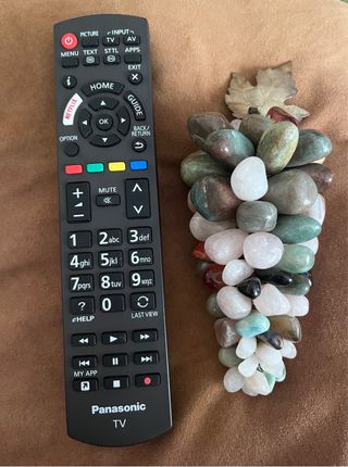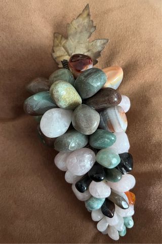 Precioso racimo de uvas decorativo hecho con piedras naturales variadas. Ideal para añadir un toque de elegancia a cualquier espacio. - Elaborado con piedras pulidas de diferentes colores y texturas. - Incluye una hoja decorativa en la parte superior. - Diseño único y artesanal.