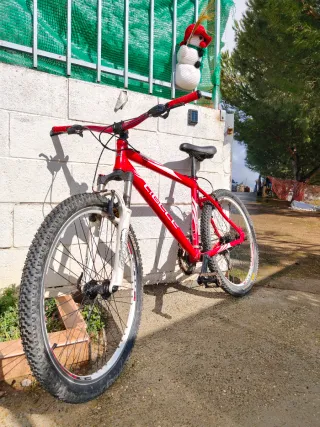 Bicicleta de montaña de color rojo, ideal para paseos y aventuras. - Cuadro de aluminio. - Ruedas todoterreno. - Frenos de disco. -Suspensión regulable.