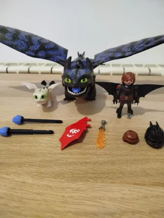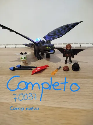 Set de Playmobil de la película de Dragones, modelo 70037. Cómo entrenar a tu dragón 3. El ser está completo e impecable. Perfecto para regalar. Incluye: Dragón negro, Desdentao o Furia Nocturna. Lanza flechas por la boca (incluidas). Tiene un dorsal luminoso, en perfecto estado el compartimiento de las pilas, funciona. Las alas están perfectas. Las uñas de las patas están todas, salvo una uña. Incluyo la pata de repuesto para cambiar. Lleva dos colas, negra y roja. Hipo vikingo, con traje de vuelo. Completo con sus dos pelucas, casco, alas, muñequeras y espada. Dragón bebe blanco de ojos verdes, perfecto estado. Envío protegido.