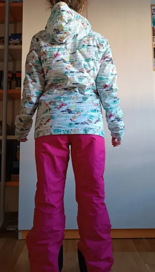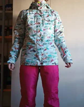 Es una chaqueta de esquí o snowboard impermeable Wed'ze Free 300 para mujer. Múltiples bolsillos, dos laterales con cremallera, uno en la manga para fortfait, uno interno, otro exterior en el pecho, capucha amplia. Está como nueva. Talla XS, aunque es holgada y tapa el culo. Yo diría que vale perfectamente para S. Protege contra el frío, viento y nieve. Super calentita y suave por dentro. Presenta un estampado abstracto multicolor sobre una base principalmente blanca.