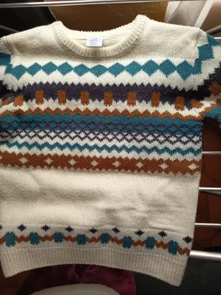 Jersey de punto para niño con un diseño estampado. - Cuello redondo. - Manga larga. - Estampado de rombos y líneas en varios colores.