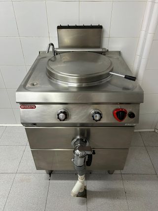 Caldera de acero de la marca INDX para cocer productos de carnicería o cocina con desague incorporado, en perfecto estado. - Fabricada en acero inoxidable. - Funciona con propano. - Panel de control con mandos. - Incluye grifo. Medidas: 1,1 m de alto x 0,9m de ancho x 0,7 de largo