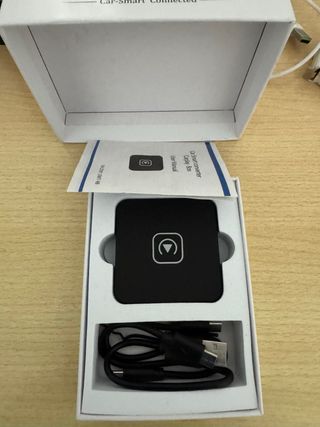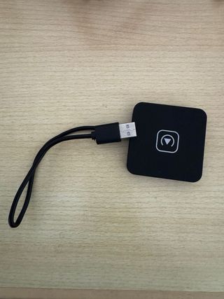 Adaptador para conectar tu iPhone a CarPlay. Incluye el dispositivo y cable. - Diseño compacto y negro. - Indicador luminoso en la parte superior.