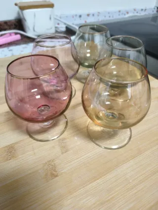 Conjunto de cuatro copas de cristal con un toque de color. - Diseño elegante con borde dorado. - Tonos rosados y ámbar. - Base estable. Y 4 en pequeñitos esos van de regalo
