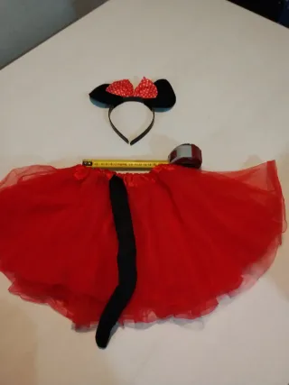 Conjunto de disfraz de Minnie Mouse para niña. - Diadema con orejas y lazo rojo de lunares. - Tutú rojo con goma elastica - Cola negra.