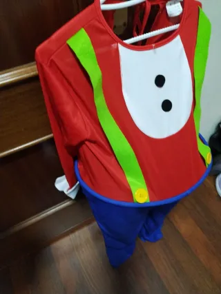 Disfraz de payaso para niños, ideal para fiestas o carnaval. Incluye sombrero y traje. - Sombrero rojo con flor azul y centro amarillo. - Traje rojo con pechera blanca y dos botones negros. - Tirantes verdes con botones amarillos. - Pantalón azul.