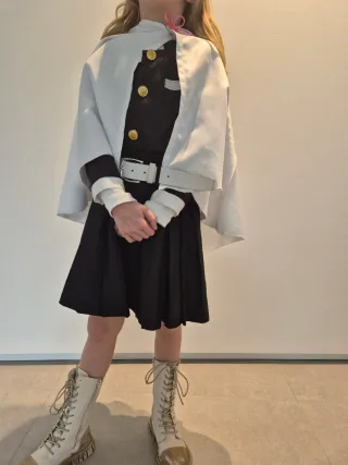 Disfraz de Kanao Tsuyuri del anime Demon Slayer. TALLA 6/7 , si es menuda como la mía también para 8 años. - Incluye capa blanca con textura y abalorio. - Vestido con detalles dorados. - Cinturón blanco. NO ESTÁ MUY BIEN - Botas altas blancas y doradas. HABRÍA QUE RETOCARLAS.