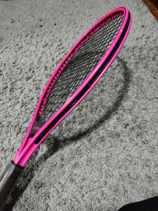 Raqueta de tenis con un llamativo diseño en color rosa. - Marco de color rosa brillante. - Cuerdas negras. - Mango con agarre oscuro.