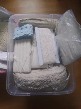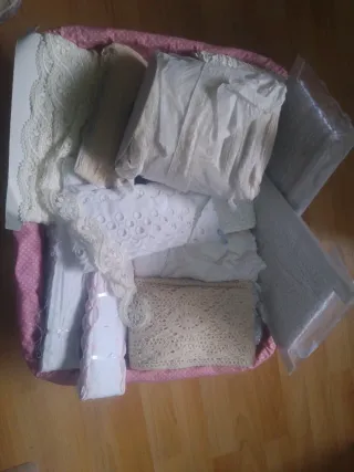 Lote variado de encajes, puntillas, pasacintas y entredoses en diferentes tonos, blanco, beige, rosa, azul, rojo ... Ideal para carnaval también, trajes medievales... - Variedad de diseños y anchos. - Ideal para manualidades y costura creativa. - Materiales textiles de calidad. Restos de tienda, precios de liquidación. Venta en persona.