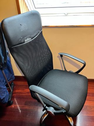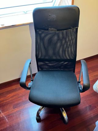 Silla de oficina con un diseño ergonómico y moderno. El tapizado está bastante afectado, de ahí el precio. - Respaldo alto de malla transpirable. - Asiento acolchado para mayor comodidad. - Brazos curvos. - Base con ruedas para fácil movilidad.